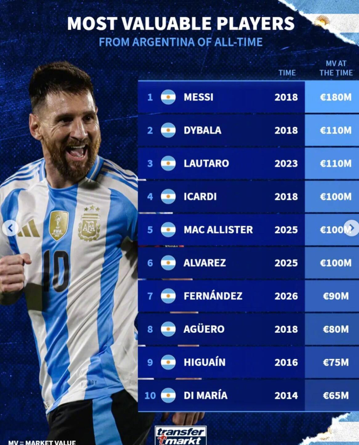 德转公布阿根廷球员身价榜,梅西1.8亿欧居首|莱昂内尔·梅西|劳塔罗-马丁内斯|迪巴拉|排名|历史_新浪体育_新浪新闻 德转统计了阿根廷球员历史身价最高榜。梅西在2018年时身价达到最高的1.8亿欧排名第一;2018年的迪巴拉以1.1亿排名第二;2023年... 德甲 2026.04.02 0 3